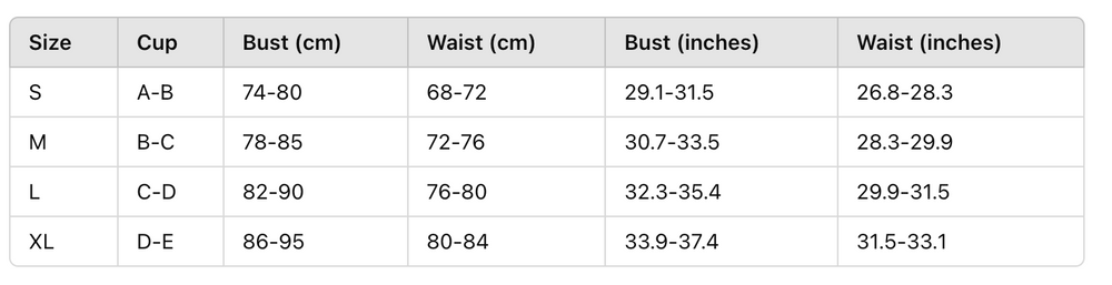 | Size | Cup | Bust (cm) | Waist (cm) | Bust (inches) | Waist (inches) |