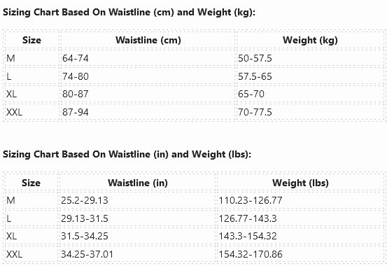 Sizing Chart Based On Waistline (cm) and Weight (kg):