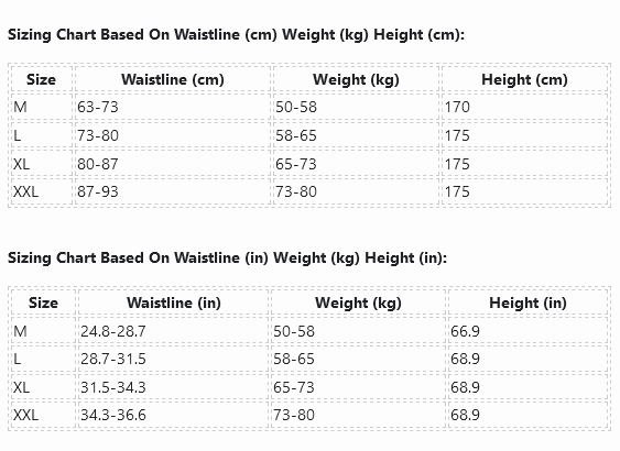 | Size | Waistline (cm) | Weight (kg) | Height (cm) |