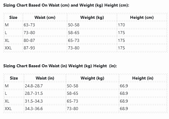 | Size | Waist (cm) | Weight (kg) | Height (cm) |