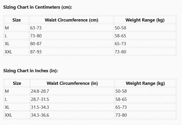 | Size | Waist Circumference (cm) | Weight Range (kg) |
