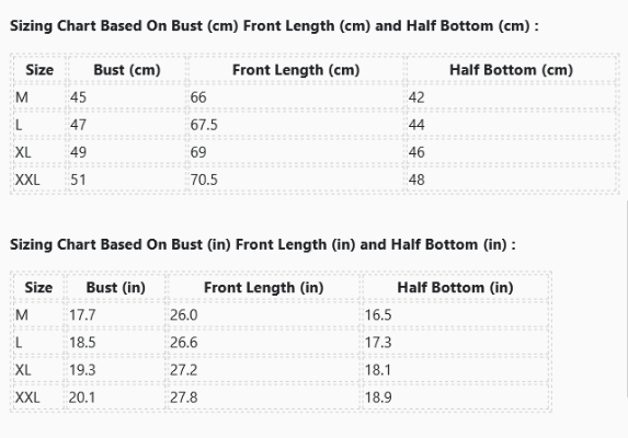 Sizing Chart Based On Bust (cm) Front Length (cm) and Half Bottom (cm) :