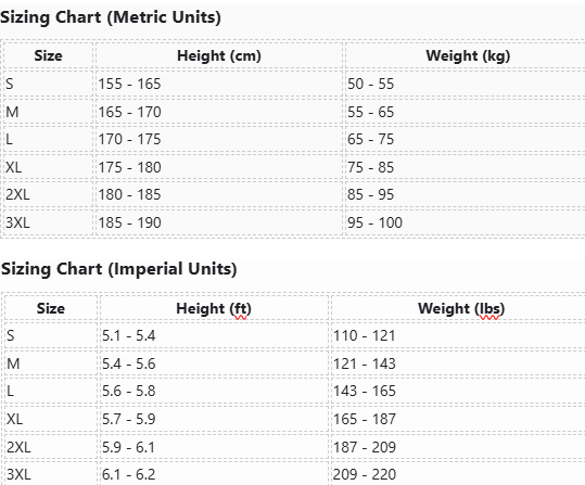 | 2XL | 5.9 - 6.1 | 187 - 209 |