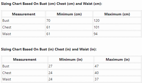 Sizing Chart Based On Bust (cm) Chest (cm) and Waist (cm):