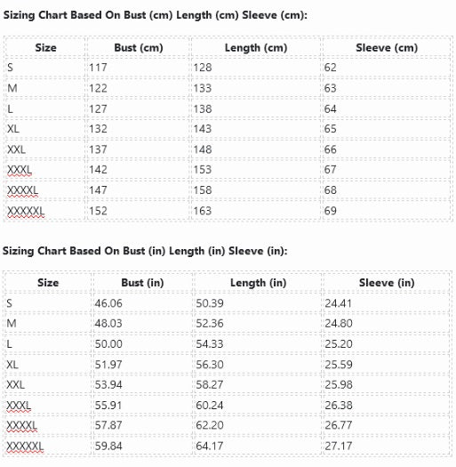 Sizing Chart Based On Bust (cm) Length (cm) Sleeve (cm):