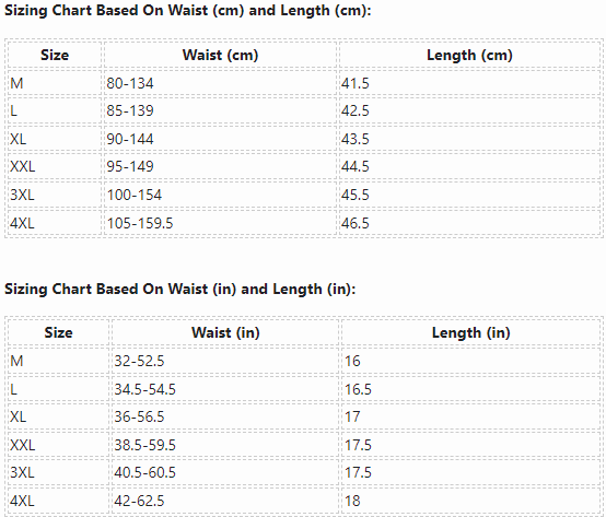 Sizing Chart Based On Waist (cm) and Length (cm):