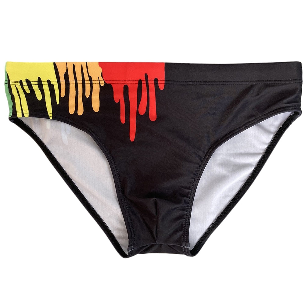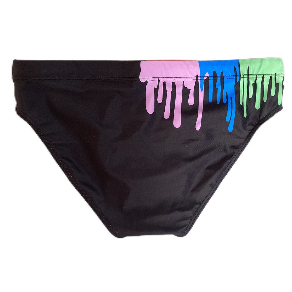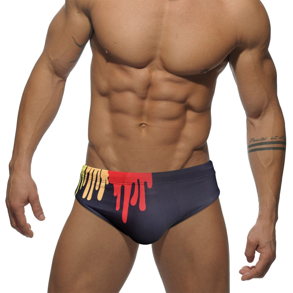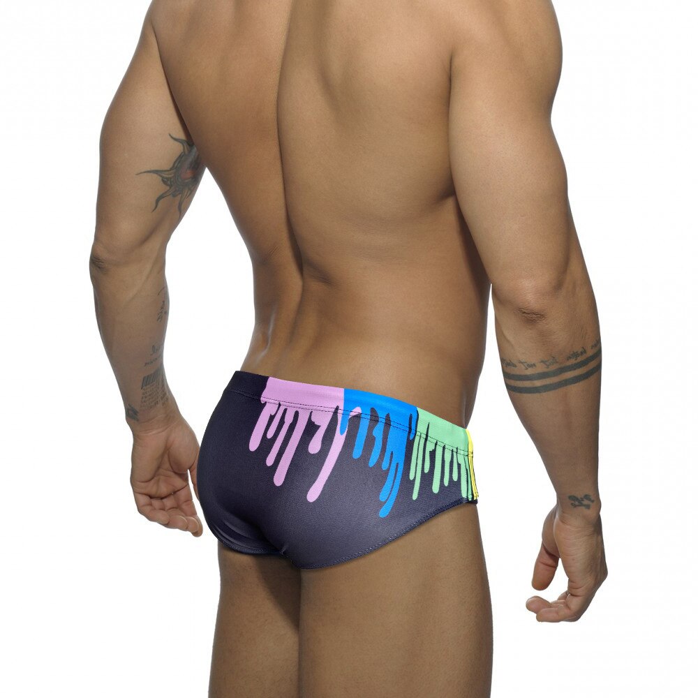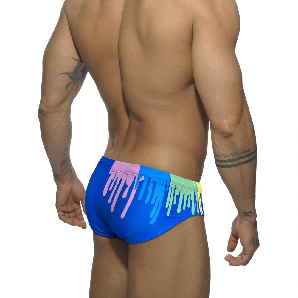 These steamy swim briefs, available in both blue and black, feature a tantalizing rainbow-esque paint drip design cascading down the sides, ensuring that all eyes will be on you as you strut your stuff by the water.