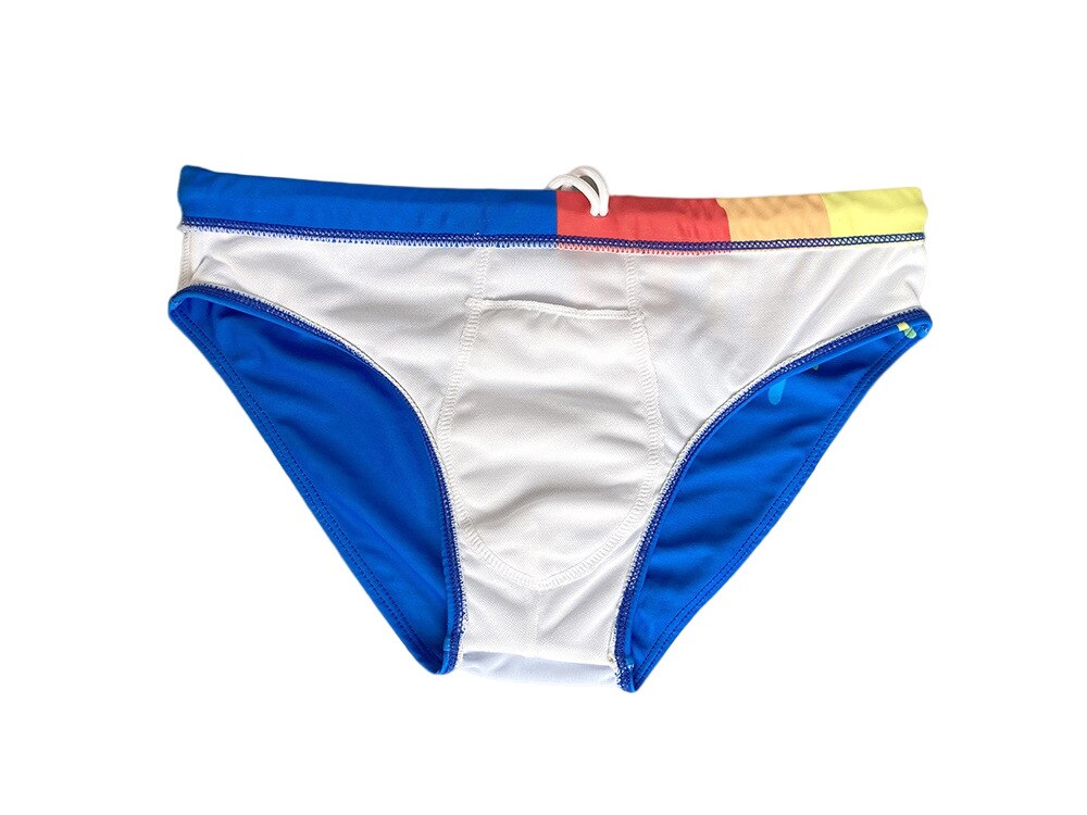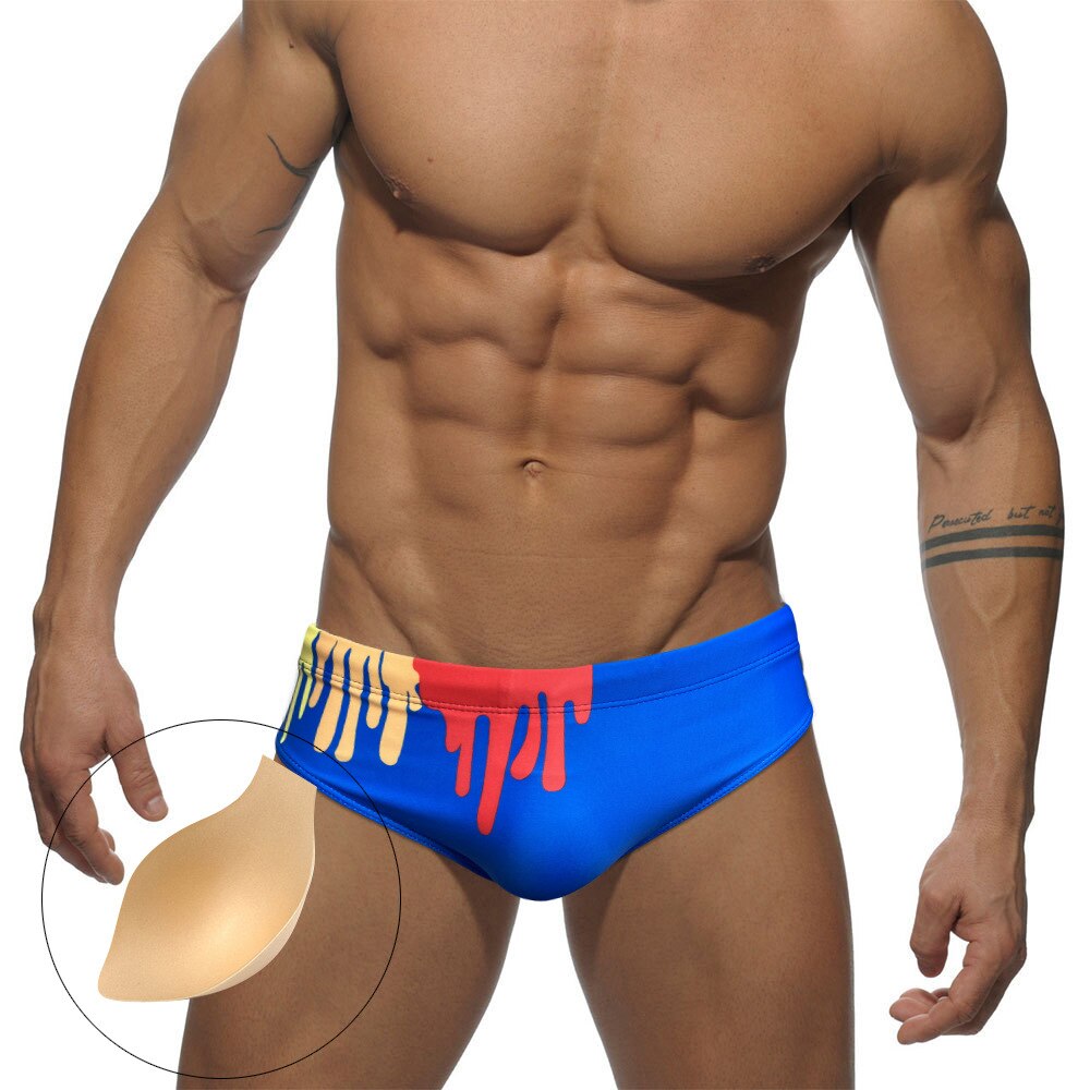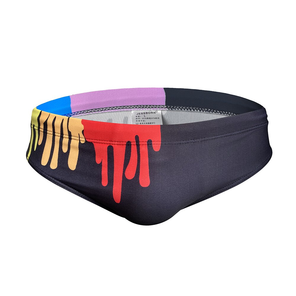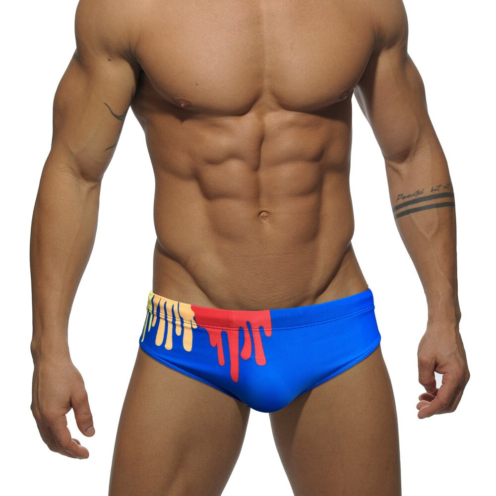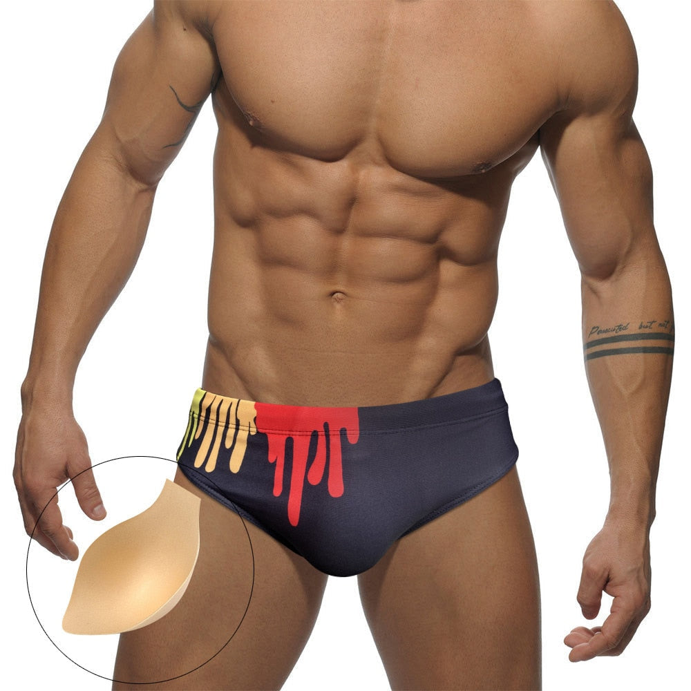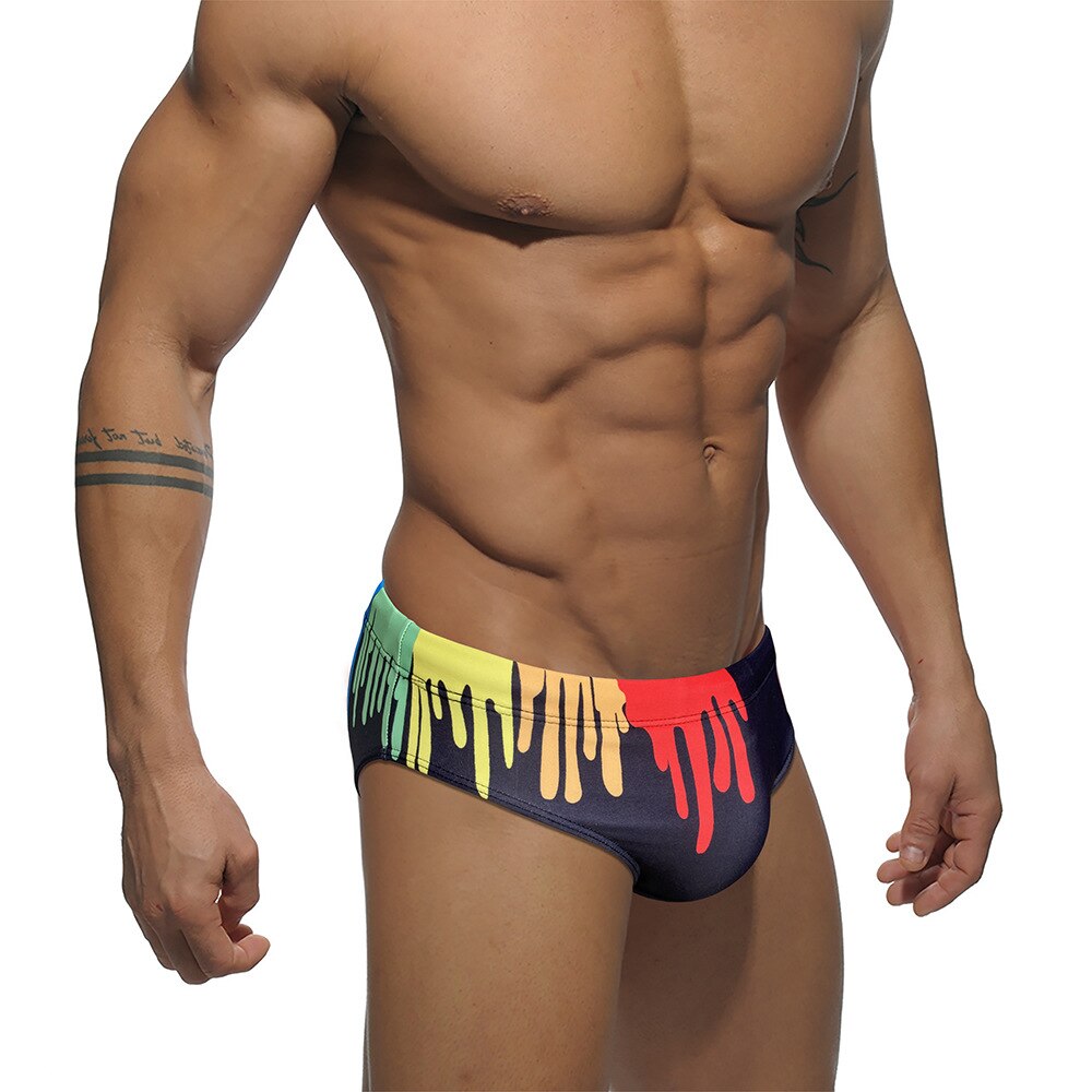 These steamy swim briefs, available in both blue and black, feature a tantalizing rainbow-esque paint drip design cascading down the sides, ensuring that all eyes will be on you as you strut your stuff by the water.