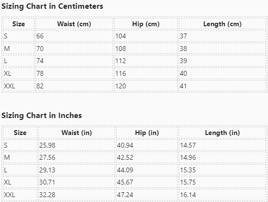 | Size | Waist (cm) | Hip (cm) | Length (cm) |