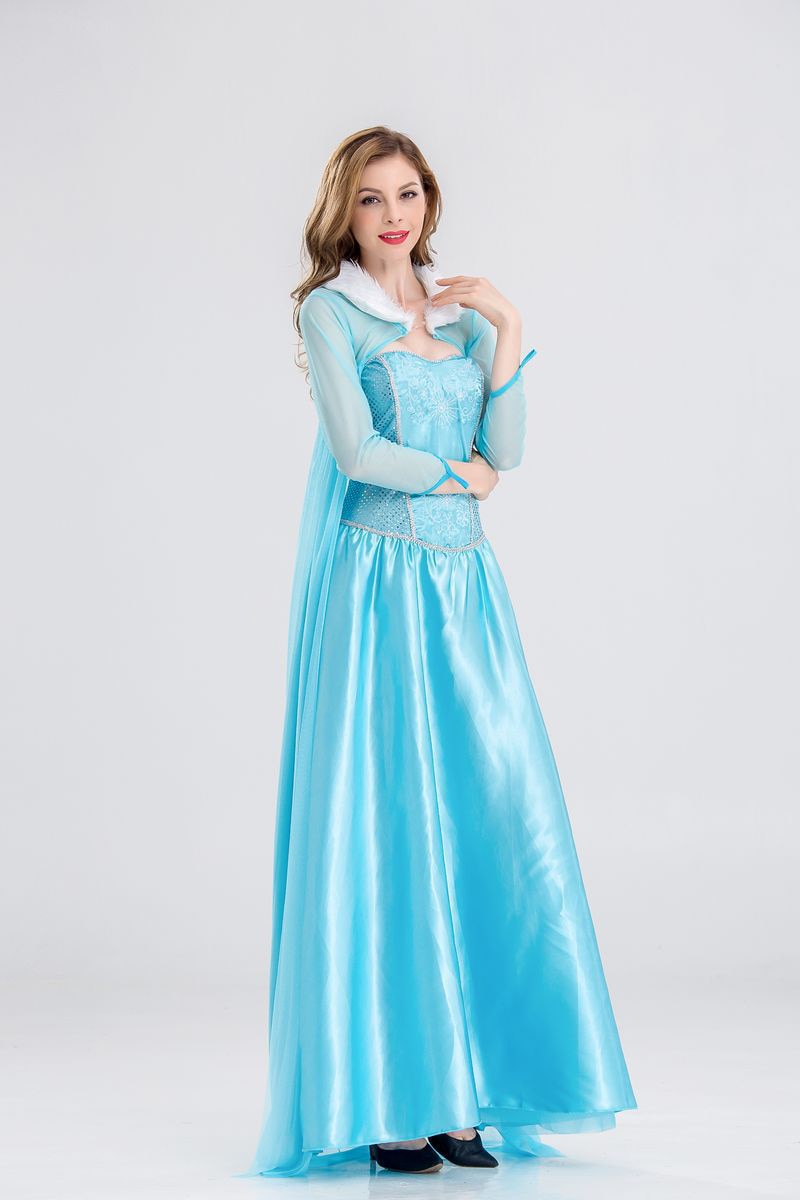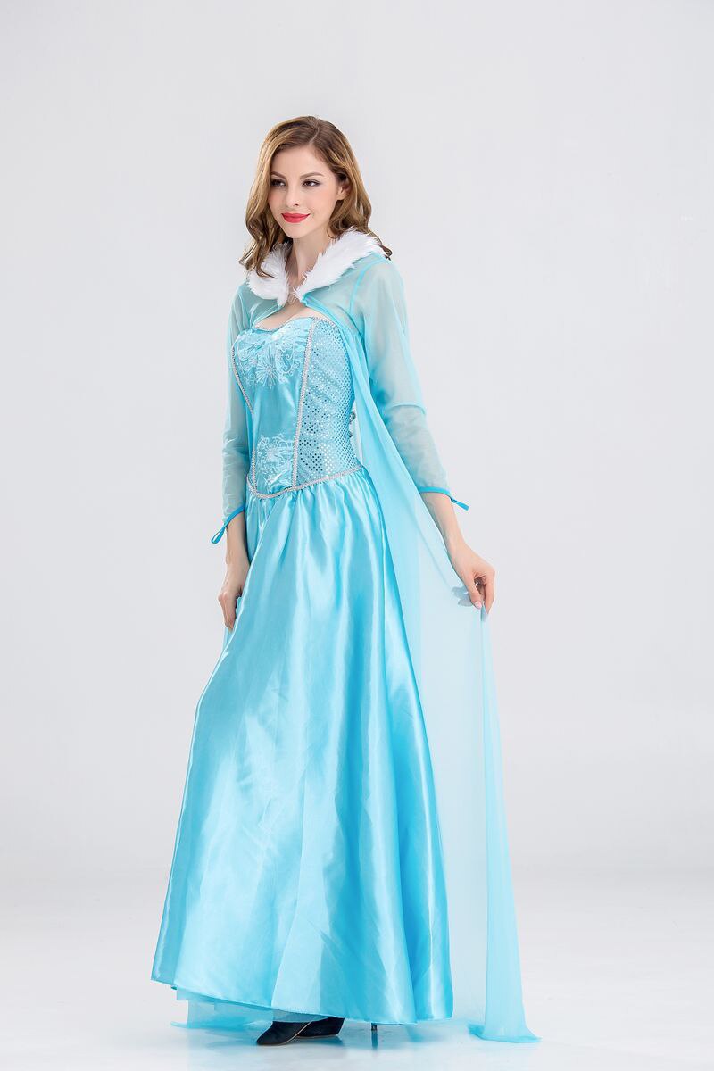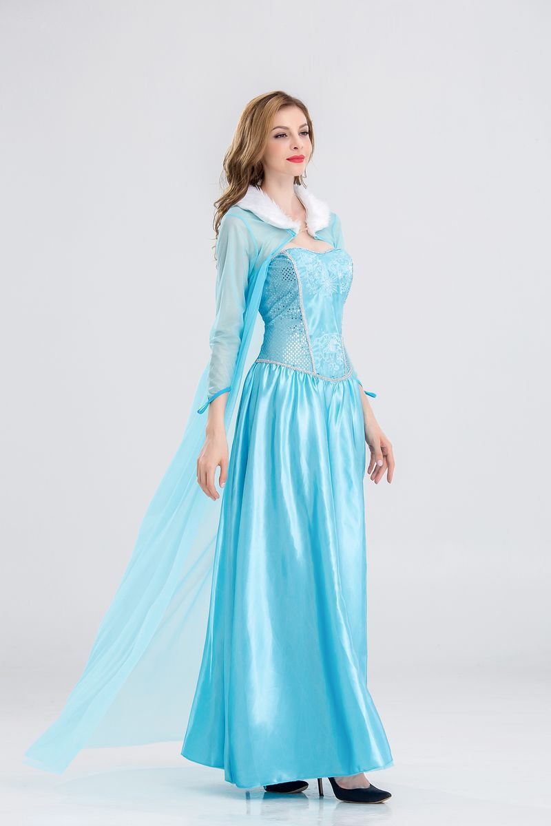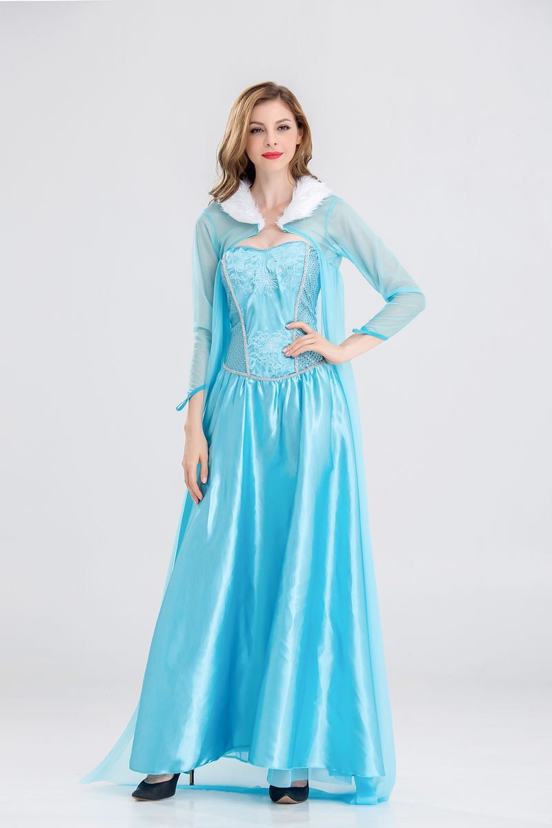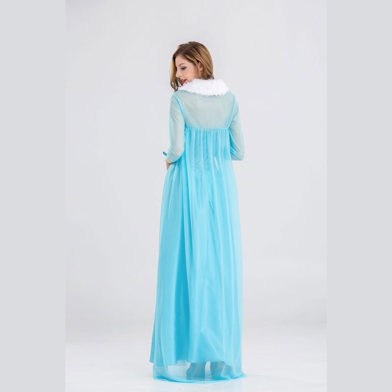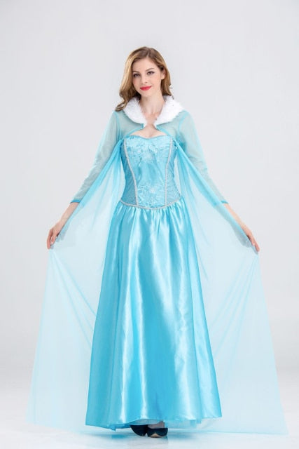 Become the very embodiment of feminine grace. The dress is beautiful icy blue-white/cyan, featuring snowflake motifs adorning the bodice. The stylish sheer cape is accented with a faux-fur collar adding to the Ice Queen aesthetic.