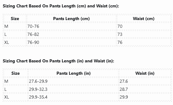 Sizing Chart Based On Pants Length (cm) and Waist (cm):