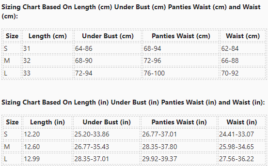 Sizing Chart Based On Length (cm) Under Bust (cm) Panties Waist (cm) and Waist (cm):