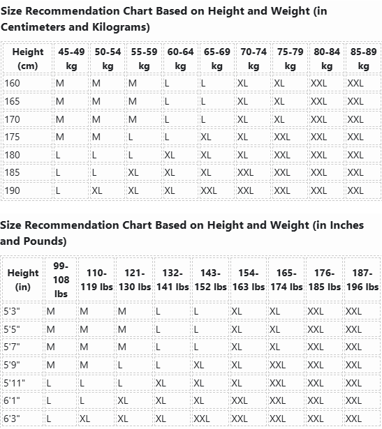 | 190 | L | XL | XL | XL | XXL | XXL | XXL | XXL | XXL |
