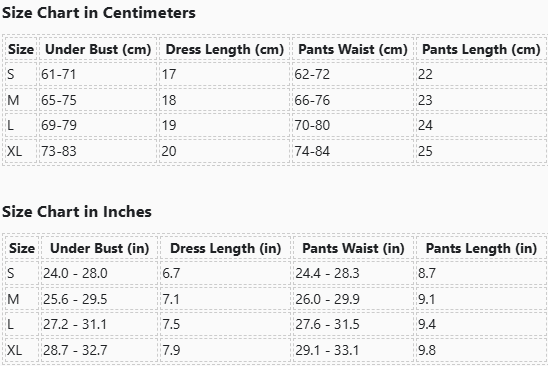 | Size | Under Bust (cm) | Dress Length (cm) | Pants Waist (cm) | Pants Length (cm) |