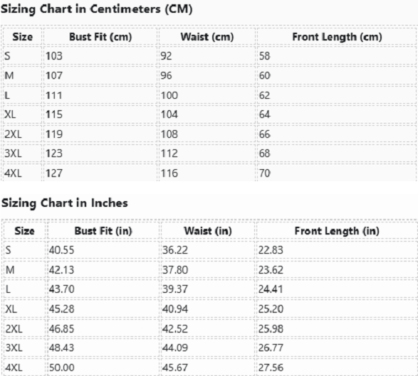| Size | Bust Fit (cm) | Waist (cm) | Front Length (cm) |