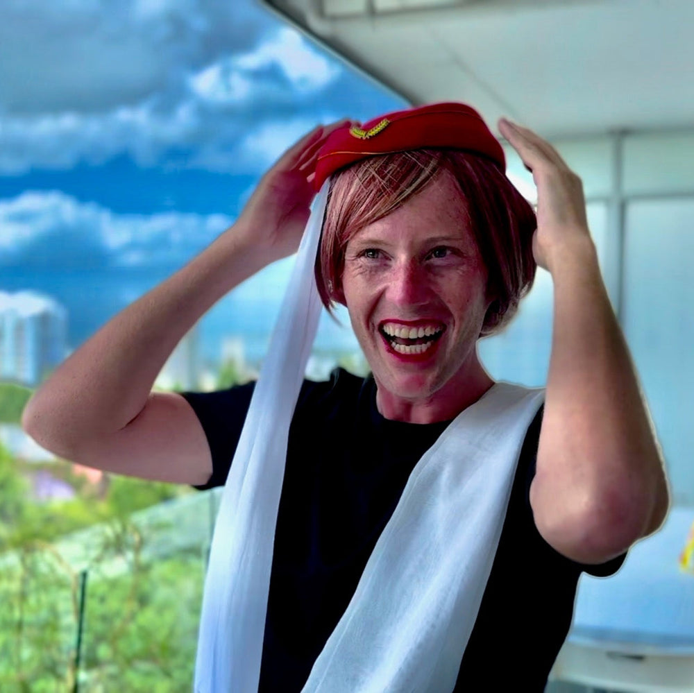A structured, scarlet-red (or other colour) beret-style hat with a golden wing emblem, for instant authority and air hostess allure.