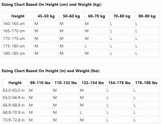 Sizing Chart Based On Height (cm) and Weight (kg):