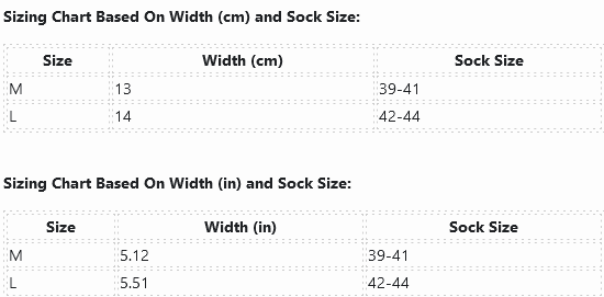 | Size | Width (cm) | Sock Size |