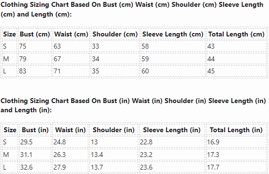 | Size | Shoulder (cm) | Bust (cm) | Sleeve Length (cm) | Total Length (cm) |