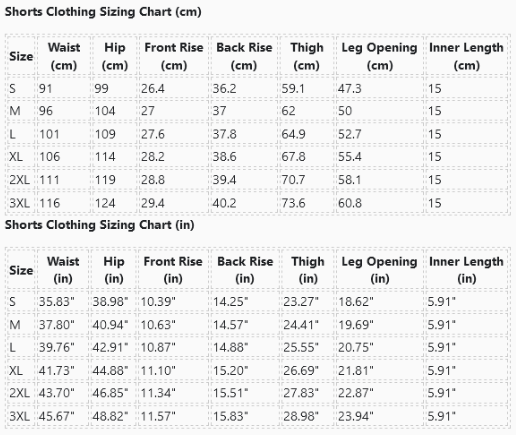 | Size | Waist (cm) | Hip (cm) | Front Rise (cm) | Back Rise (cm) | Thigh (cm) | Leg Opening (cm) | Inner Length (cm) |