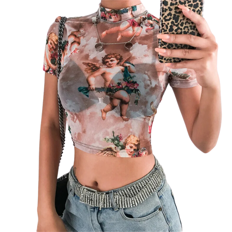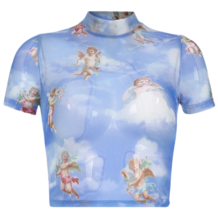 With a playful blend of ethereal florals and whimsical cherub motifs, this crop top invites you to celebrate your body with a burst of celestial charm and a dash of daring.