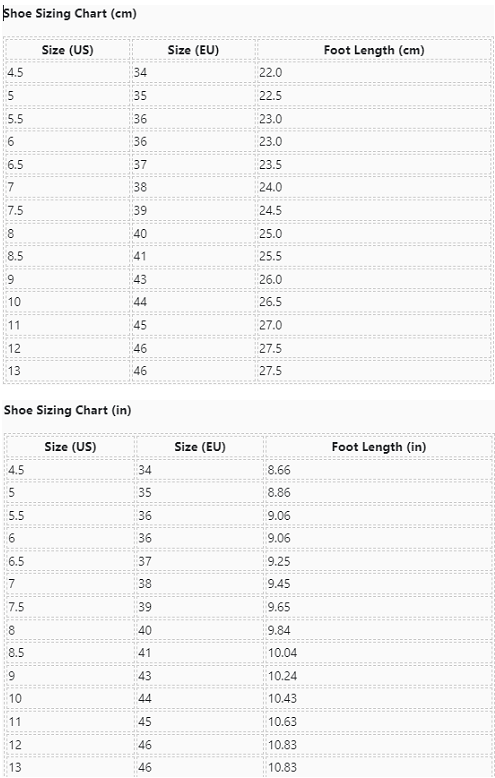 | Size (US) | Size (EU) | Foot Length (cm) |
