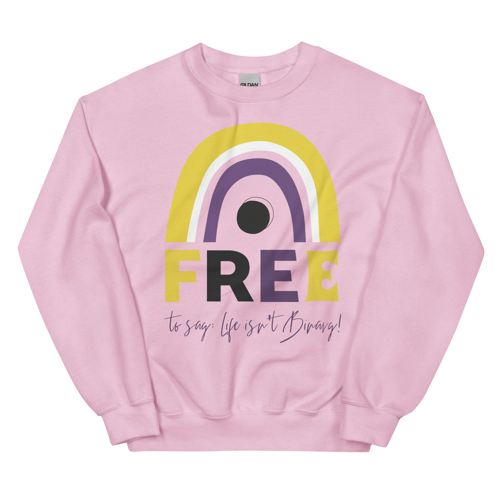 So, wear this Free To Say: Life Isn'T Binary! Unisex Sweatshirt with all the courage, playfulness, sass, and fabulosity our community embodies. It’s your soft armor in a world that needs more queer joy, a statement piece that says, “I’m here, I’m queer, and I’m cozy as all get-out.”