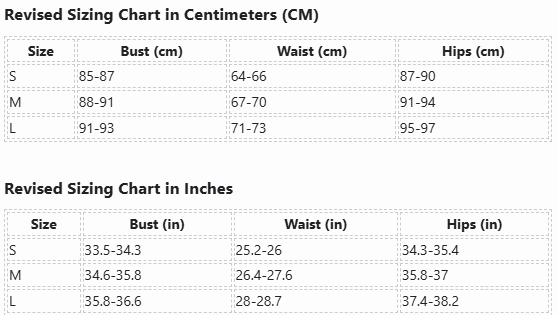| Size | Bust (cm) | Waist (cm) | Hips (cm) |