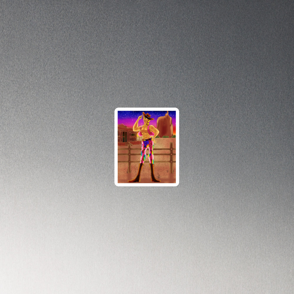 Crafted from the most supple 0.5 mm vinyl—for flexibility is our mantra—and topped with a matte finish so luxurious it could waltz down the runways of Milan, this Gay Cowboy At Sunset Magnet stands not just as a magnet but as a vibrant proclamation of style. Its magnetic black backing, steadfast as the legacy of legendary divas, elevates the Gay Cowboy At Sunset Magnet from mere functionality to a beacon of identity and elegance.