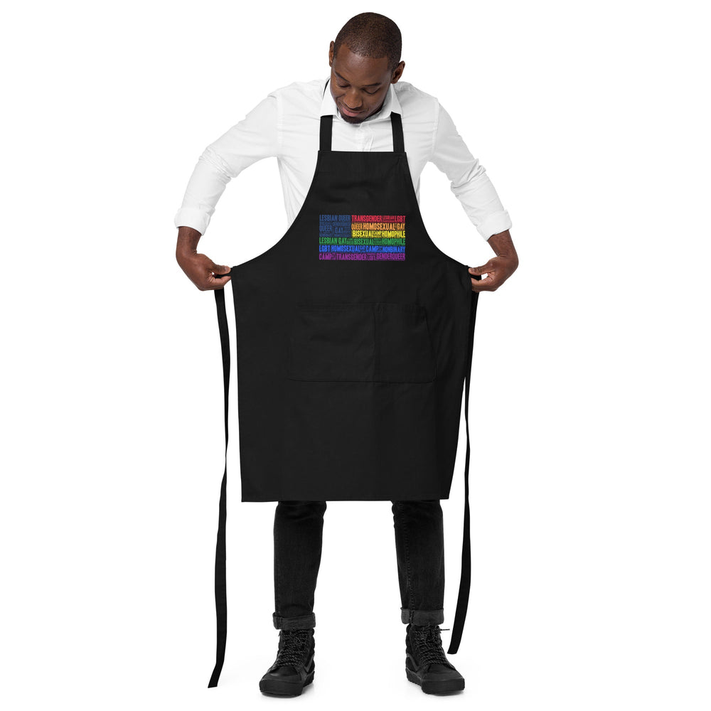 The point is that this queer apron is far from the boring old kitchen-wear your grandma used to have. This organic cotton apron is bursting at the seams with style and pizzazz, with flair and fashion and all kinds of panache. It is an excellent way to liven things up around the home and add a touch of humor, an extra dash of spice to the kitchen. There is no rule that says you can’t be cute and sexy while doing your domestic duties. And the best thing is that you can feel pride at home.