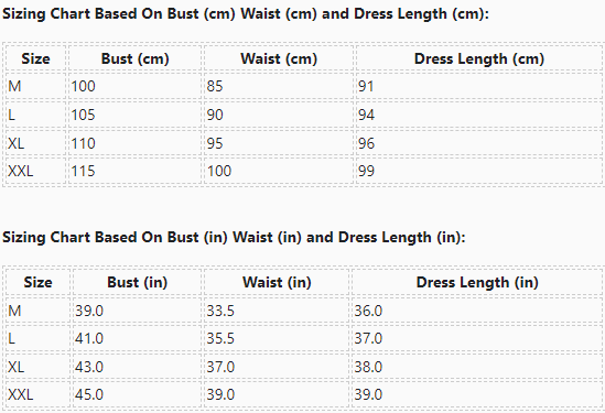 | Size | Bust (cm) | Waist (cm) | Dress Length (cm) |