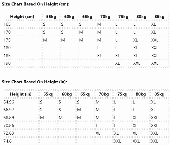 Size Chart Based On Height (cm):