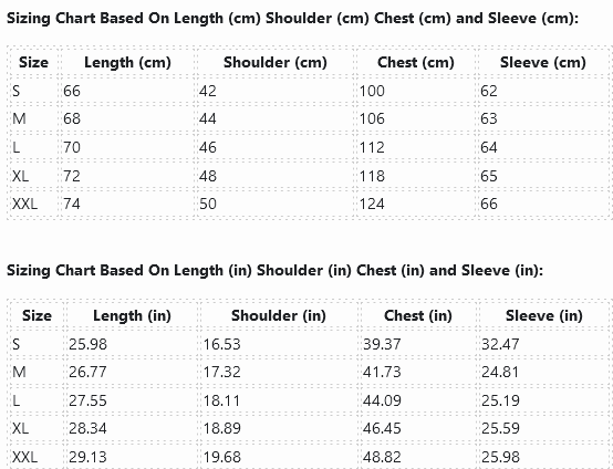 Sizing Chart Based On Length (cm) Shoulder (cm) Chest (cm) and Sleeve (cm):