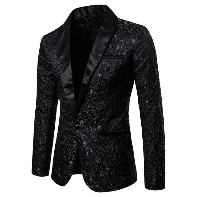Imagine yourself walking into any room, your presence amplified by the lustrous sheen of satin that dances with every movement. The gilded lapels are not just accents; they are declarations of your inner radiance, reflecting the light and commanding attention. This blazer isn't just a piece of clothing; it's an armor of confidence, a celebration of your vibrant spirit. Whether you're voguing down the runway of life or simply sipping cocktails with friends, this blazer is your ticket to an elevated existence.