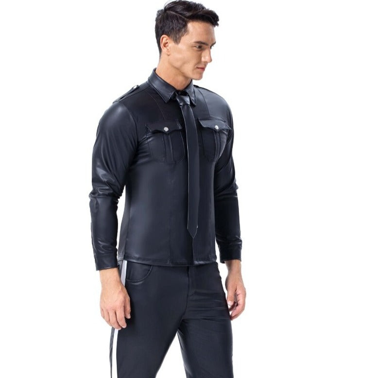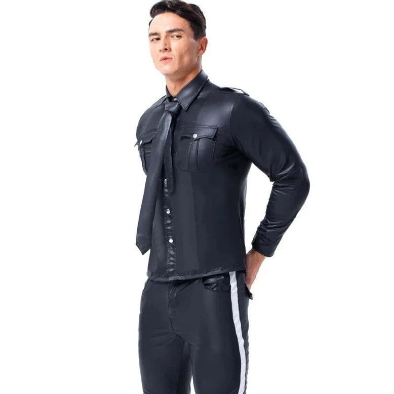 Step into the spotlight and sparkle like the star you are with the GlamPunk Glossy Leather Top. It's not just a top; it's a treasure trove of tantalizing textures and shine that'll make you the shimmering icon of any room—or Zoom. Perfect for the man who's not afraid to strut his stuff and loves to leave a little sparkle wherever he goes.
