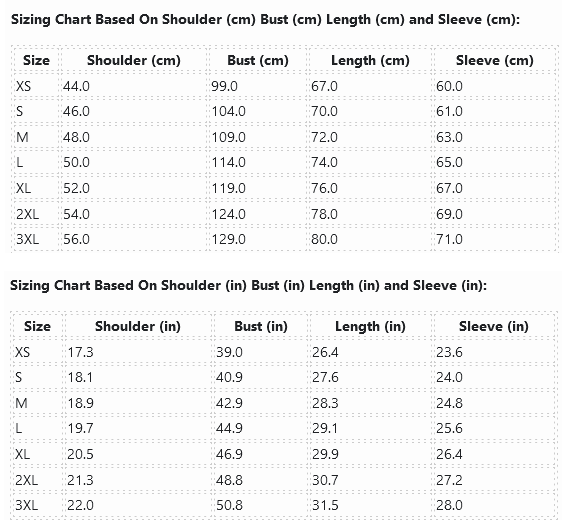 Sizing Chart Based On Shoulder (cm) Bust (cm) Length (cm) and Sleeve (cm):