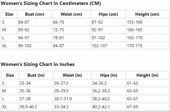 | Size | Bust (cm) | Waist (cm) | Hips (cm) | Height (cm) |