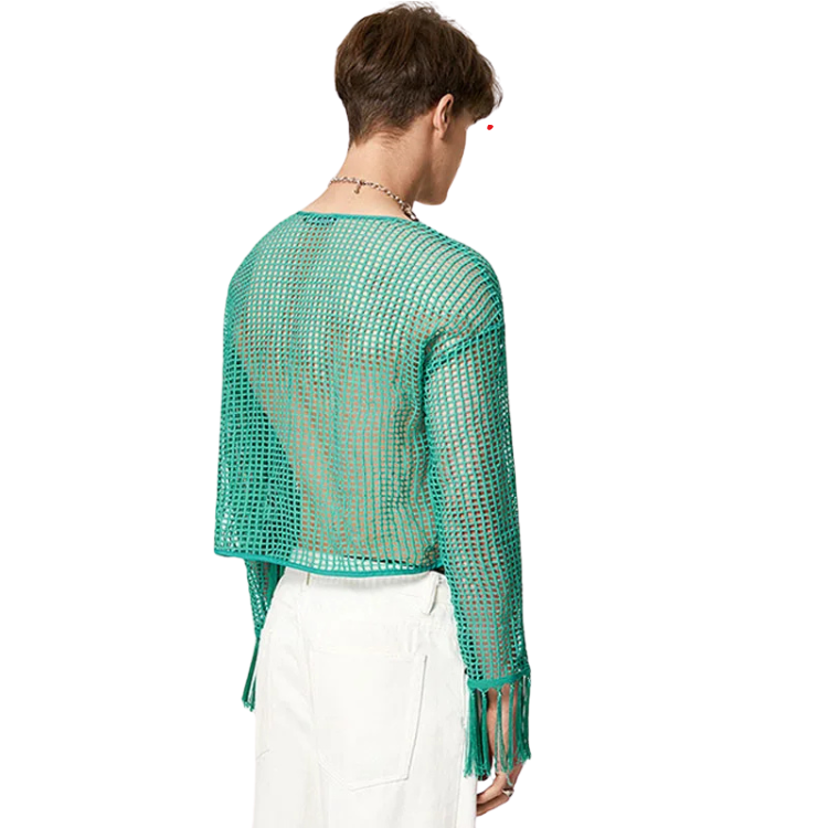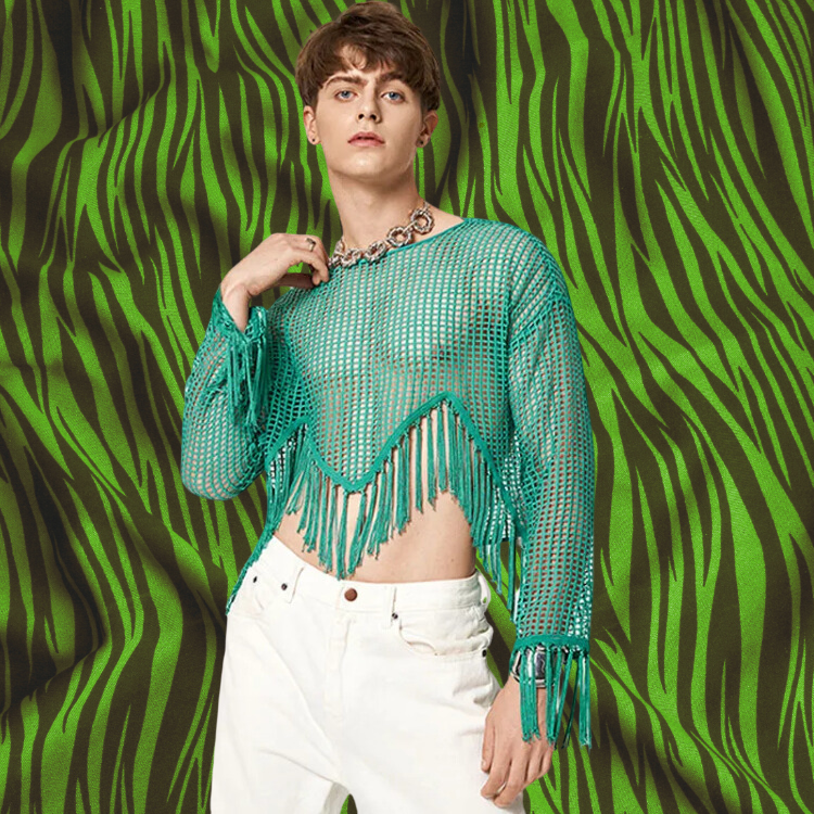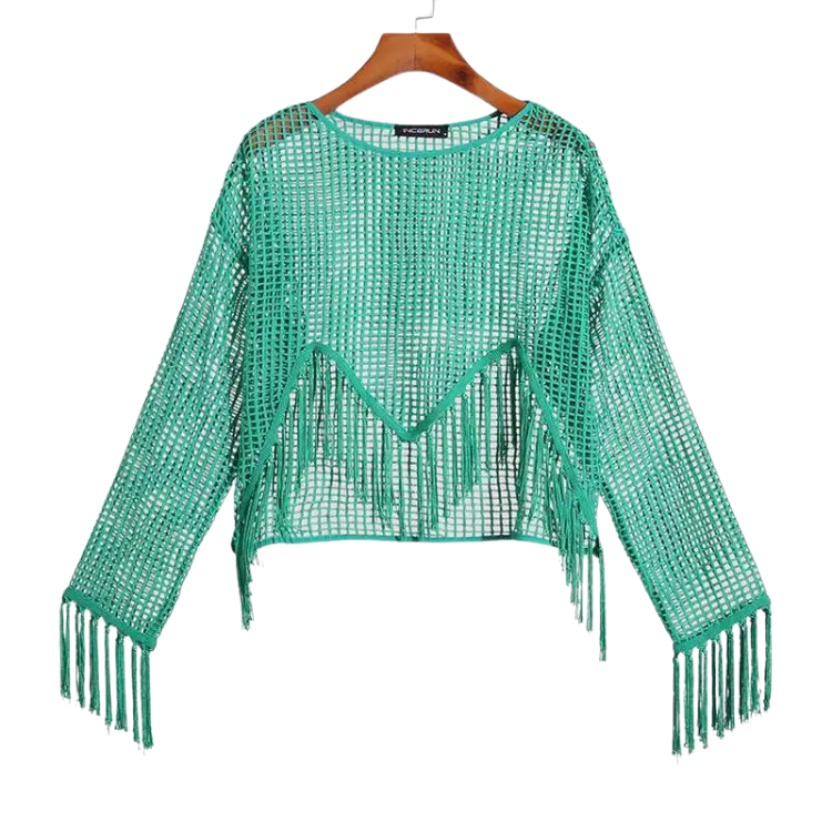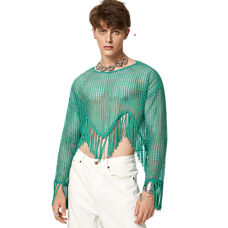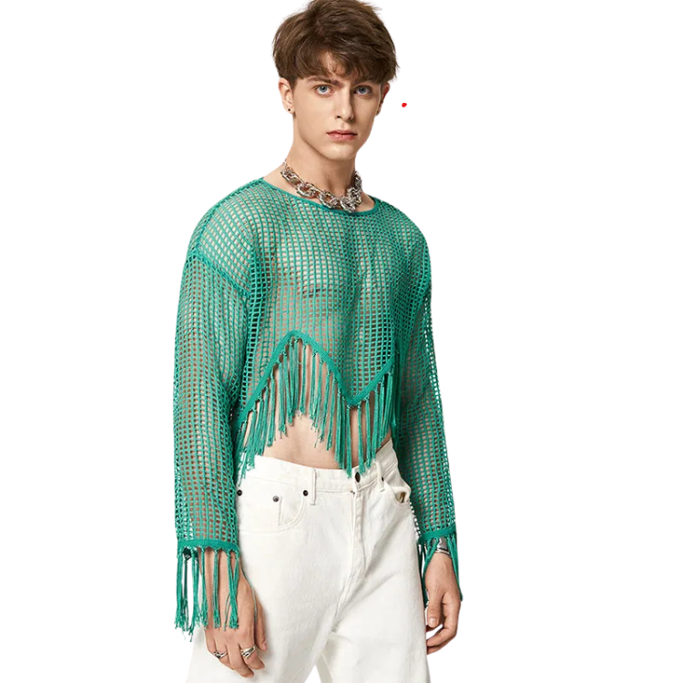 Dive into the scene with our Tasseled Emerald Fantasy Crop Top—a sartorial splash of glam that's sure to turn heads at every pride parade or party. Imagine yourself under the disco lights, tassels twirling rhythmically as you own the dance floor.