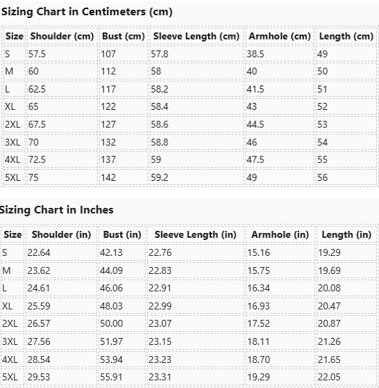 | Size | Shoulder (cm) | Bust (cm) | Sleeve Length (cm) | Armhole (cm) | Length (cm) |