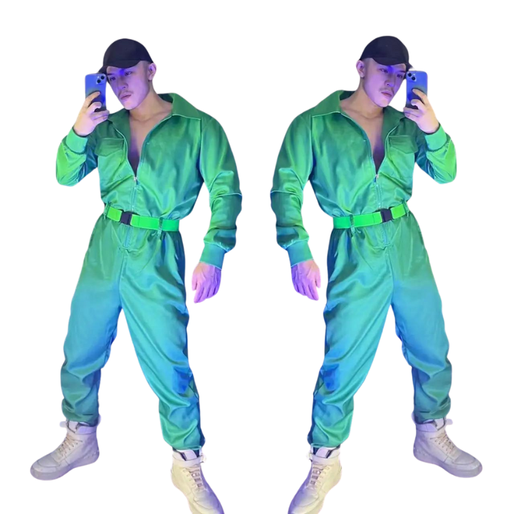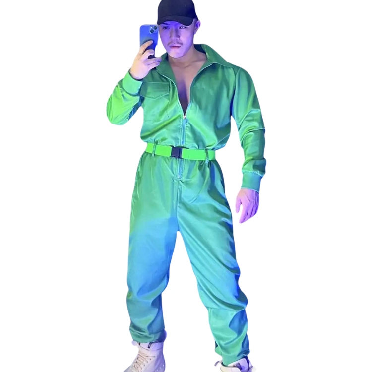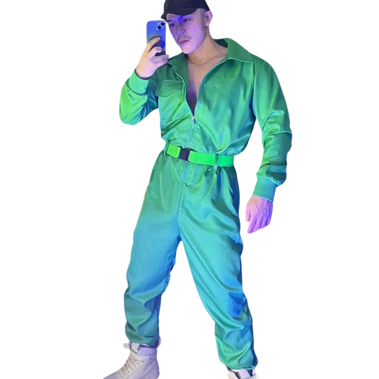 Unleash your inner diva and make heads turn with the Green Hip-hop Overall Performance Costume Set - a dazzling attire that's designed to celebrate your confidence, radiance, and undeniable sex appeal. This playful and chic ensemble is a shout-out to all the fabulous souls in the queer community who dare to stand out and slay with style.