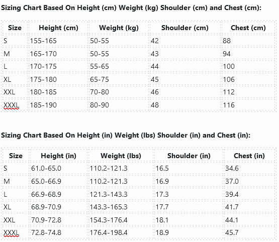 Sizing Chart Based On Height (cm) Weight (kg) Shoulder (cm) and Chest (cm):