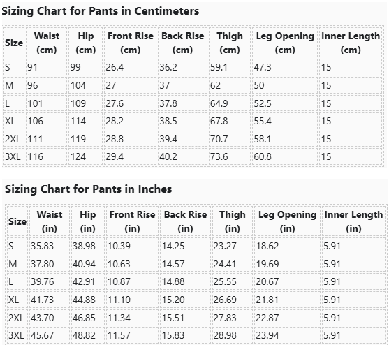 | Size | Waist (cm) | Hip (cm) | Front Rise (cm) | Back Rise (cm) | Thigh (cm) | Leg Opening (cm) | Inner Length (cm) |