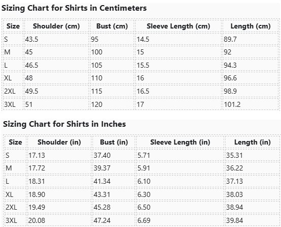 | Size | Shoulder (in) | Bust (in) | Sleeve Length (in) | Length (in) |