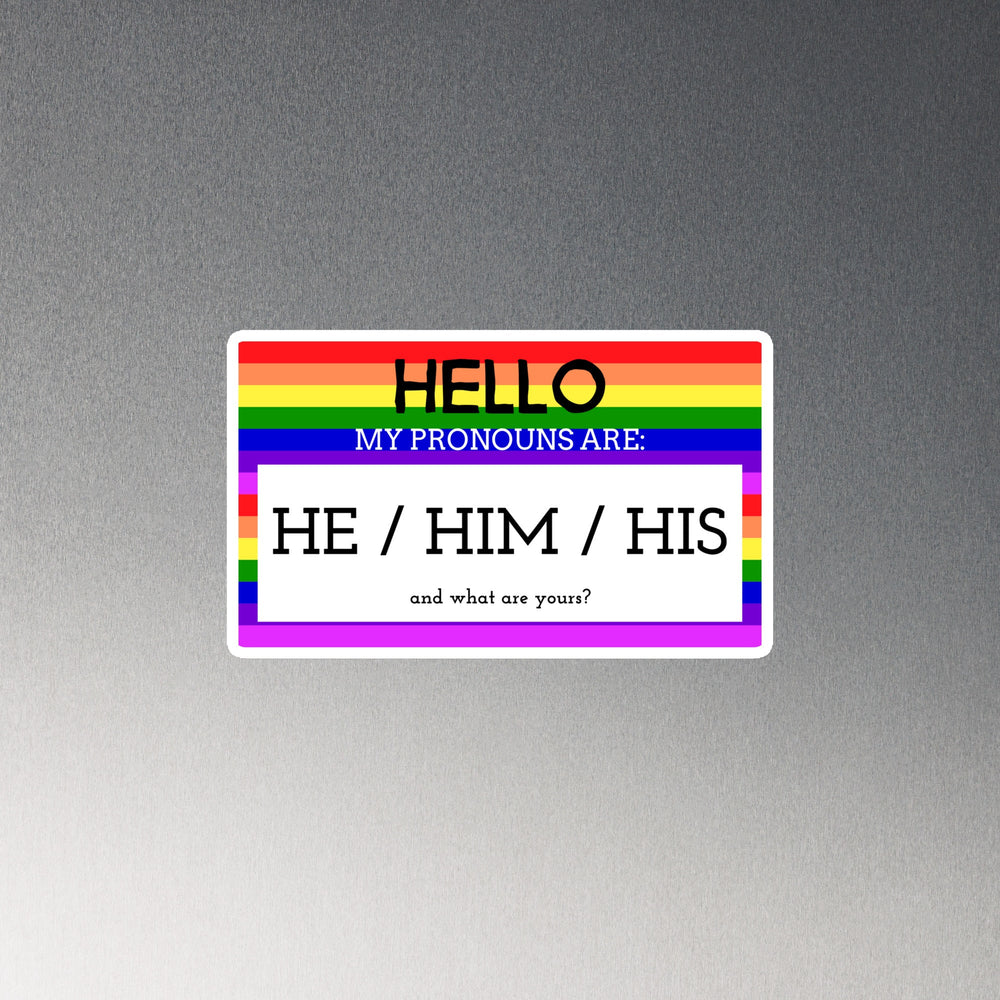 Remember, my fabulous friends, in a world awash with magnets, choosing this Hello My Pronouns Are He / Him / His Magnet and its delightful peers is not just a choice—it's an embrace of boldness, beauty, and the unapologetic expression of one's essence. With your Hello My Pronouns Are He / Him / His Magnet, your space isn't merely organized; it's a resplendent ode to all things queer, clever, and irrefutably camp, now with the added joy of splendid savings.