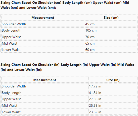 Sizing Chart Based On Shoulder (cm) Body Length (cm) Upper Waist (cm) Mid Waist (cm) and Lower Waist (cm):