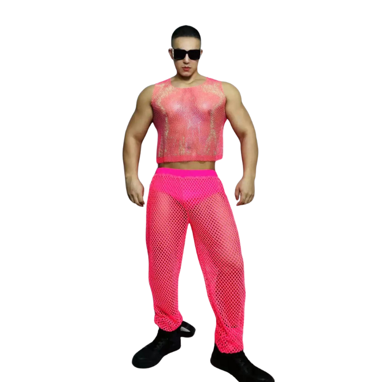 The outfit's design radiates confidence, crafted to accentuate your curves or angles, making you feel like the showstopper you are. It's a blend of daring and playfulness, perfect for those nights when you want to feel irresistible. Whether you're at a pride parade, a nightclub, or an intimate gathering, the Hot Pink Diamond Duo empowers you to own your space, be your authentic self, and revel in the spotlight that you so richly deserve.
