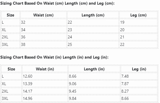 Sizing Chart Based On Waist (cm) Length (cm) and Leg (cm):