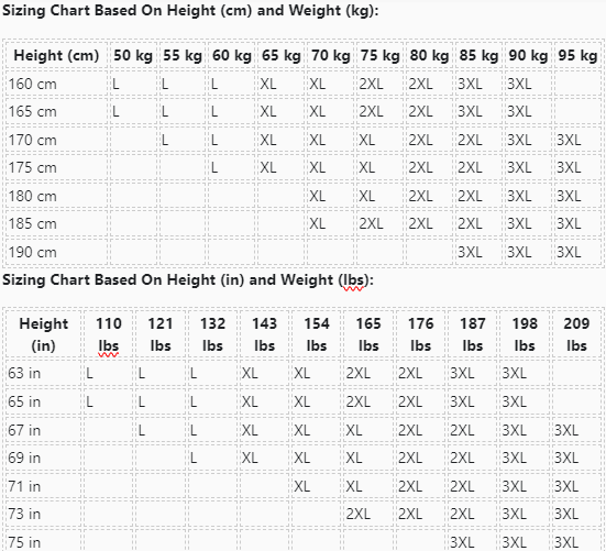 Sizing Chart Based On Height (cm) and Weight (kg):