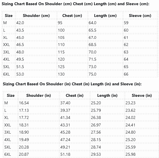 Sizing Chart Based On Shoulder (cm) Chest (cm) Length (cm) and Sleeve (cm):