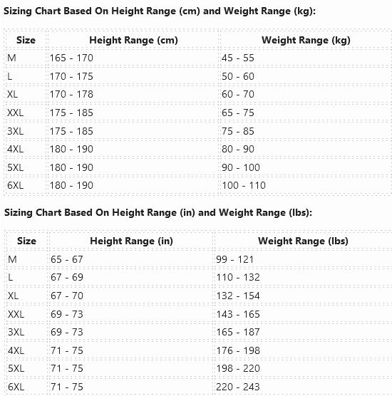 Sizing Chart Based On Height Range (cm) and Weight Range (kg):